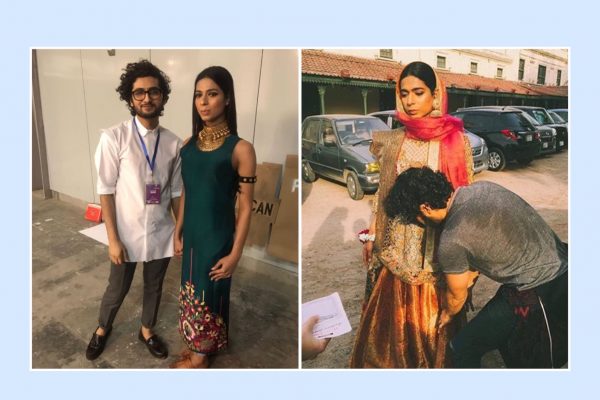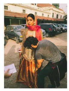 Hamza Bokhari fixing the dress on Maavia for a shoot