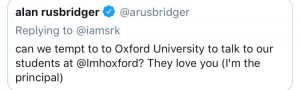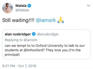 Alan Rusbridger, Principal of the Oxford University invited King Khan to deliver a lecture to his students in 2016 via twitter