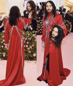 Umm this was creepy but definitely made heads turns and not just the one in his hand! Jared Leto in Gucci making quite a statement at Met Gala last night