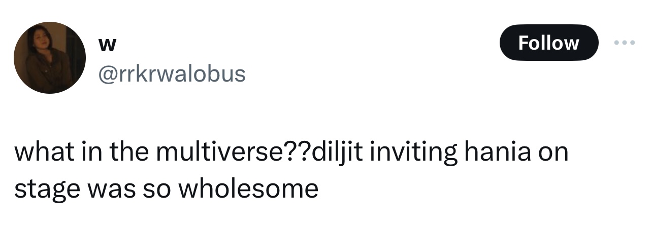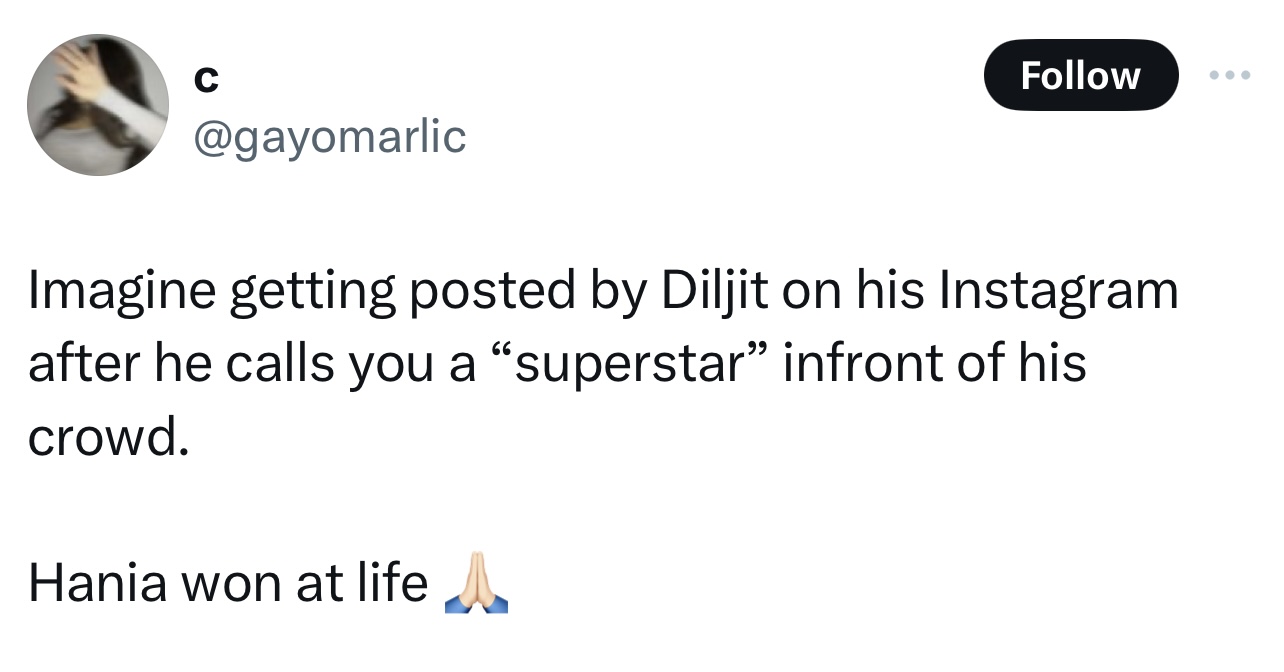 Attendees shared videos of the performance, capturing the joyous atmosphere as Diljit and Hania shared the spotlight. Fans praised Diljit for his inclusive approach to music and celebrated Hania’s presence, which added an extra layer of excitement to the concert.