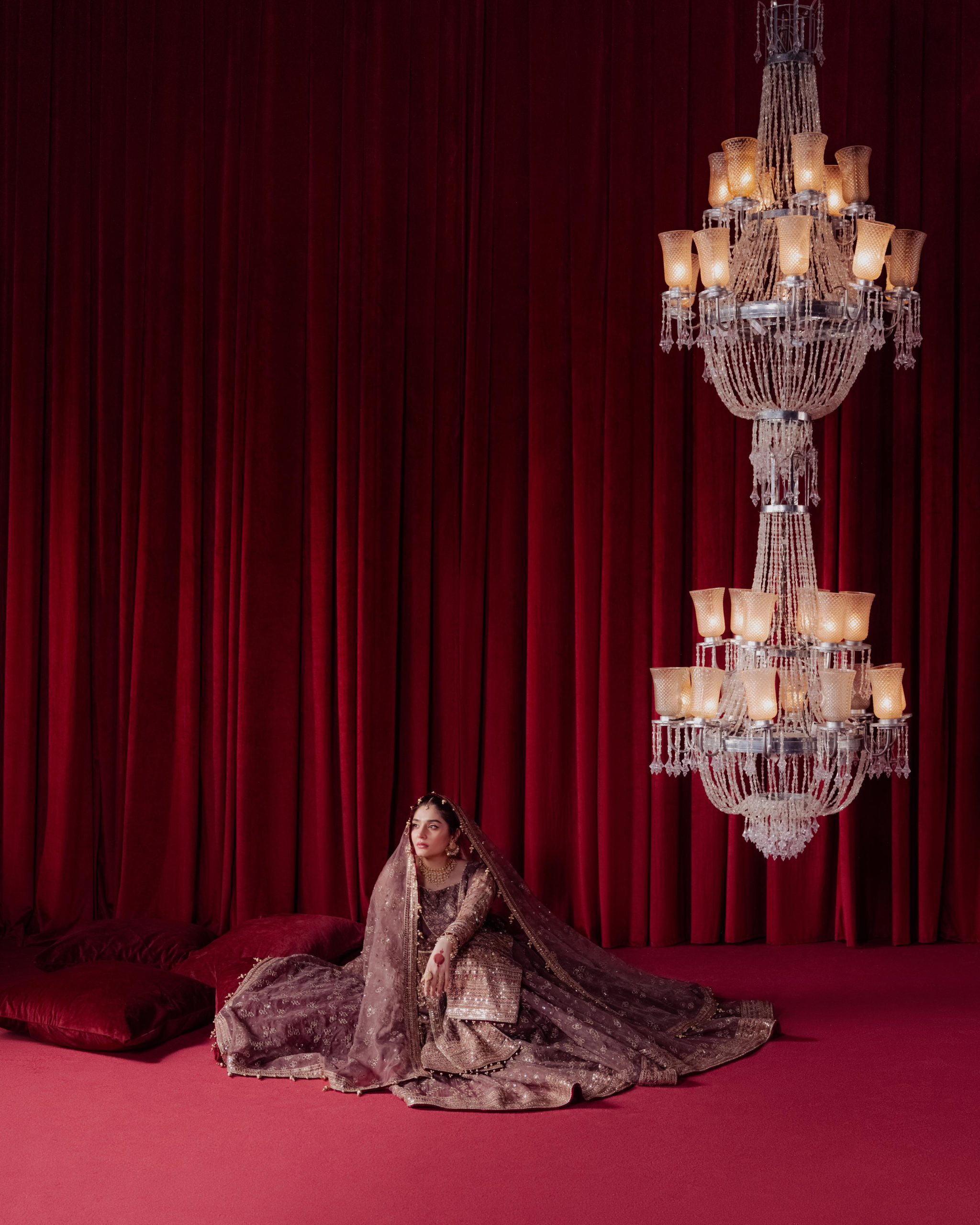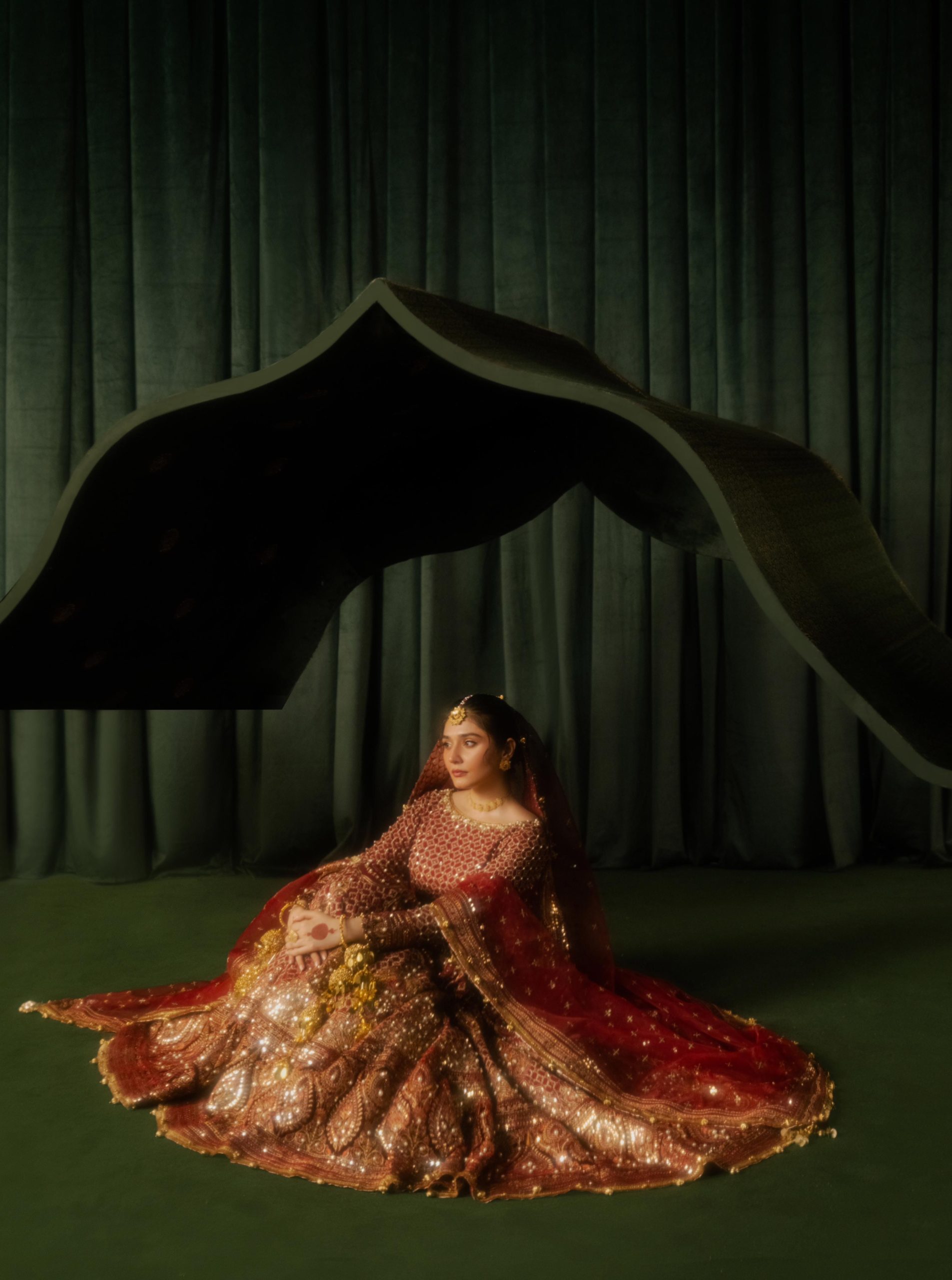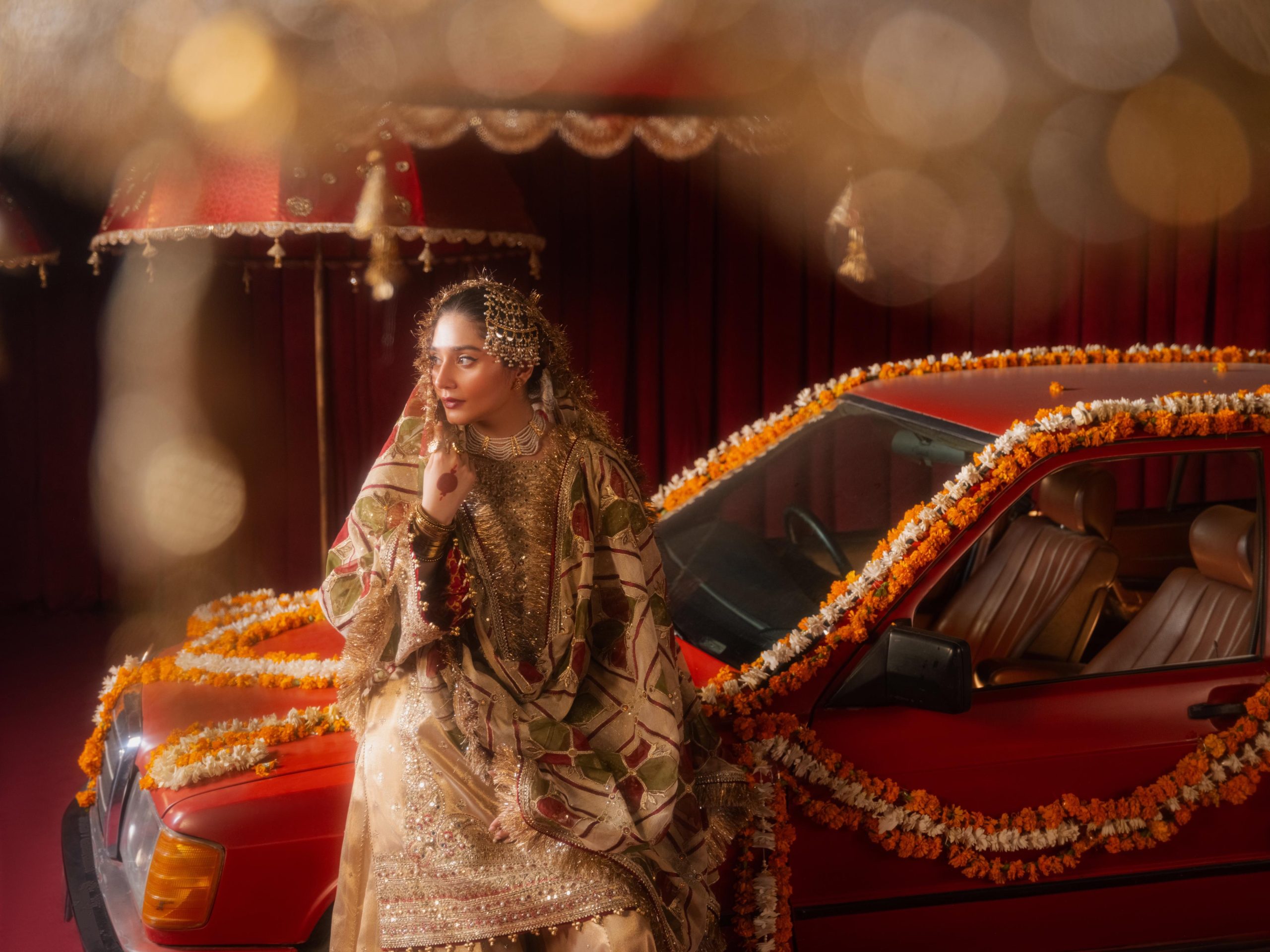 Central to this stunning campaign is actress Dur-e-Fishan Saleem, whose presence is nothing short of captivating. She isn’t just modeling the ensembles; she inhabits them, breathing life into each look with a grace that feels both regal and relatable. Whether she’s draped in a marigold-hued ensemble that evokes the joyous bloom of fresh flowers or adorned in a sindoor red outfit that carries the weight of tradition, Dur-e-Fishan embodies the modern muse. Her radiant smile, poised elegance, and quiet strength make her the perfect figure to anchor this collection, elevating its visual and emotional impact.